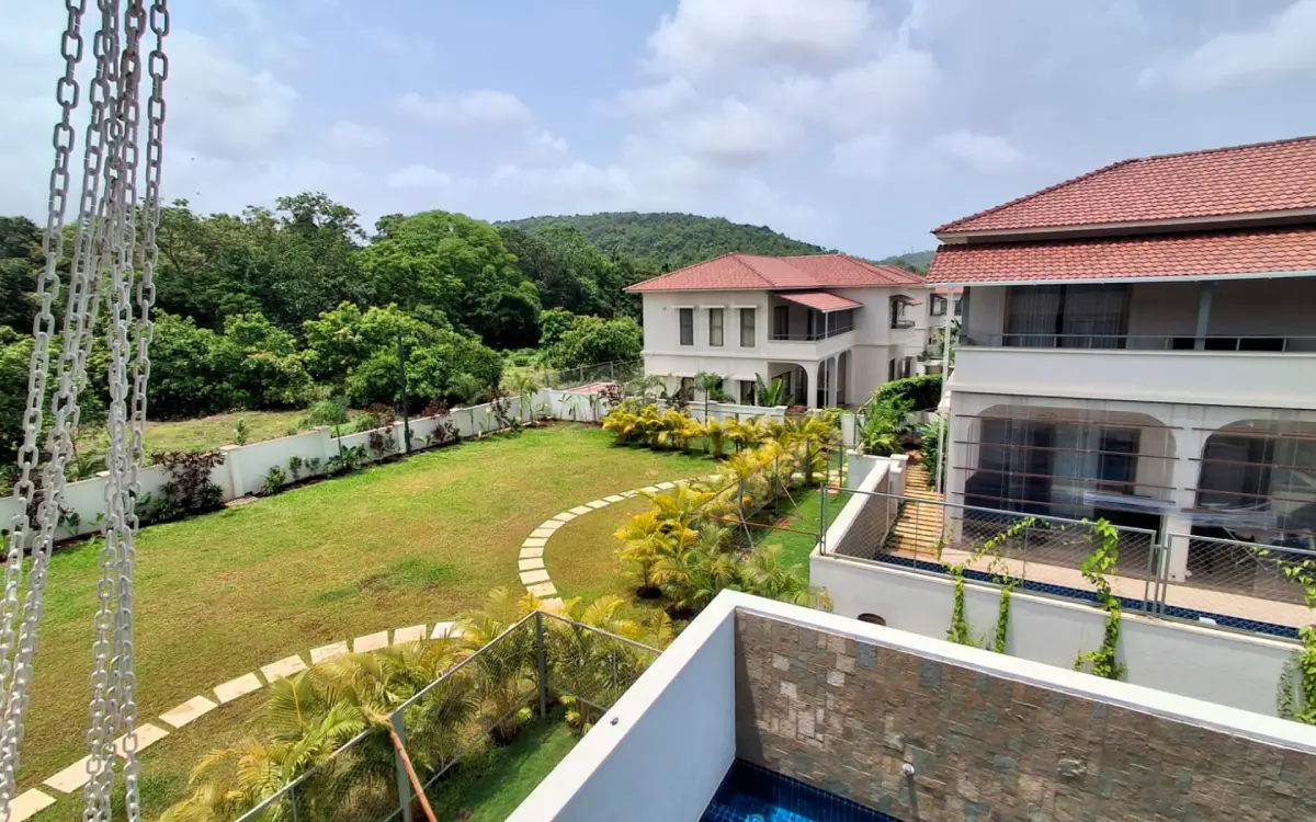 In a quiet pocket of Siolim, this 4 BHK villa with private pool in North Goa sits in a twelve-villa gated community that looks out to green hills. Large living and dining spaces open to a manicured private garden with landscaped water features and a pool deck, so you get low-density, resort-style living instead of a cramped bungalow row. Four bedrooms and five baths are planned for real everyday use, not just occasional stays.